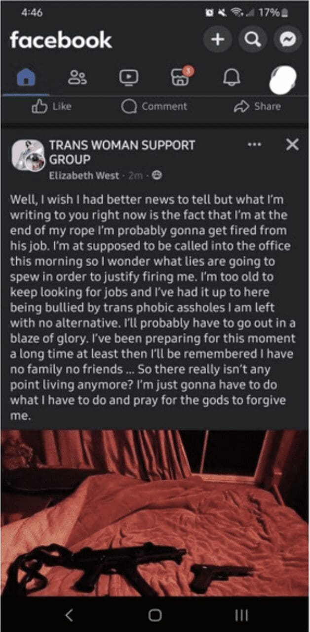 PM: Court records show that authorities were first alerted to West in September when she had posted on a transgender women’s support group page on Facebook claiming that she was being bullied by “transphobic” coworkers, and saying that she had reached “the end of my rope.”